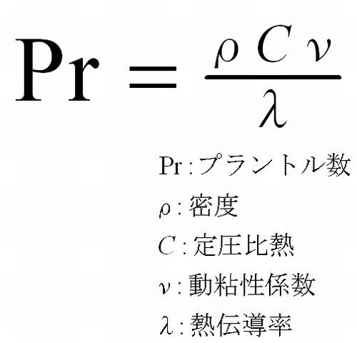 このような計算をされている方に必要な知識です 対流熱伝達量を見積る 各種ヌセルト数を計算 プラントル数とはこのように定義されます 温度境界層と速度境界層の相対的厚さの比 具体的数字としてはこのようになります 水(300K...
